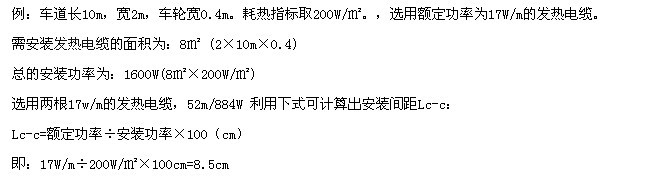 關(guān)于車道融雪化冰,為節(jié)省出資,不用在車道整個(gè)區(qū)域鋪設(shè)加熱電纜,通常裝置在車輪通過(guò)的當(dāng)?shù)鼐妥銐蛄恕?蛇x用單位裝置面積功率為200~250W/㎡,并選用帶地上傳感器的溫控器來(lái)操控。